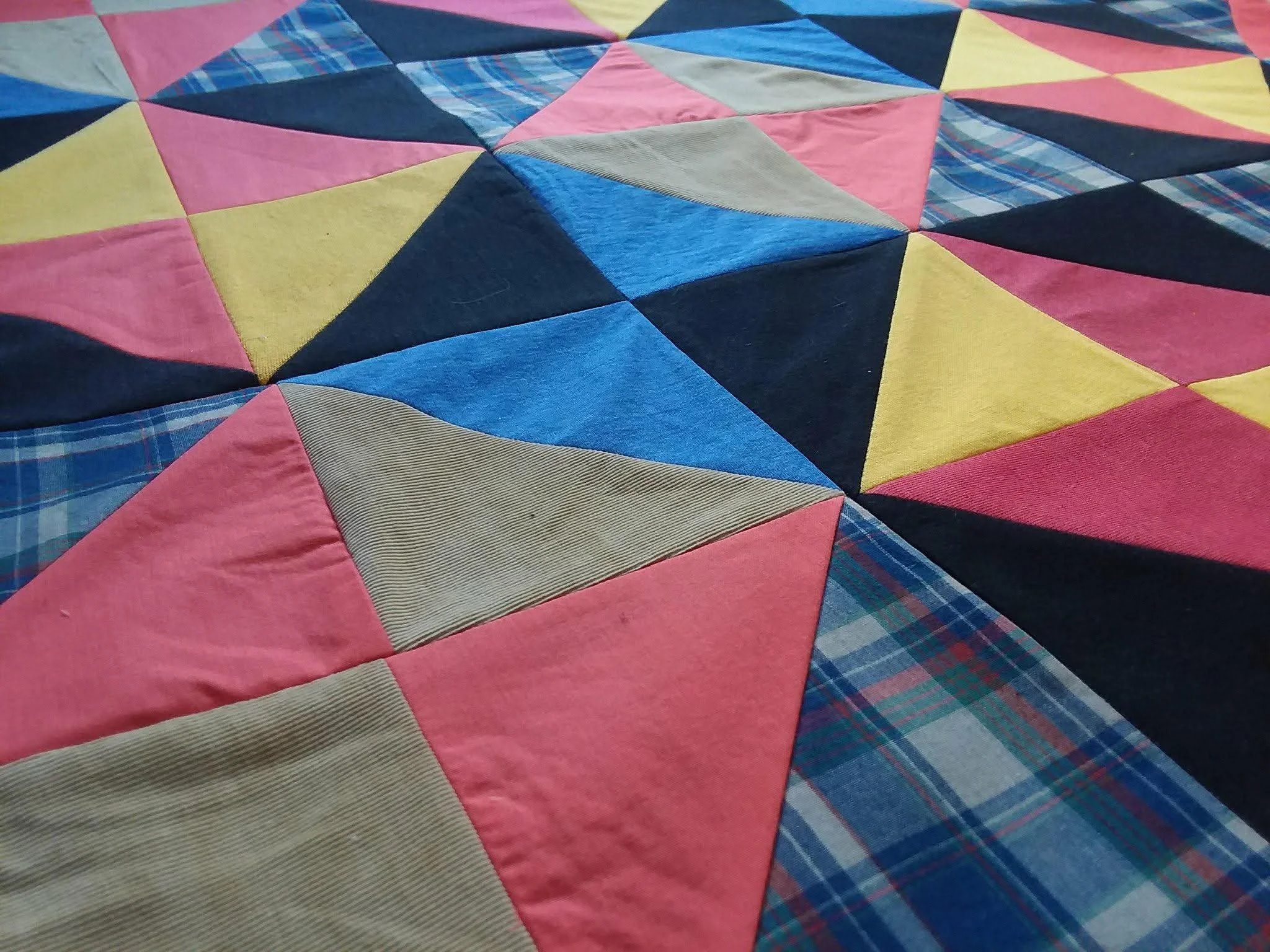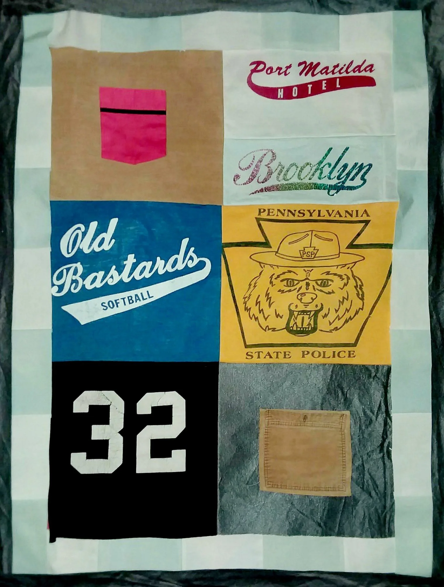 T-shirt quilt for a grandfather: I transformed a collection of a father's well-worn t-shirts into a small quilt for his grandson, preserving the physical connection across generations. Later, I worked with the same family to create a birthday gift quilt incorporating printed fabric from the son's artwork.