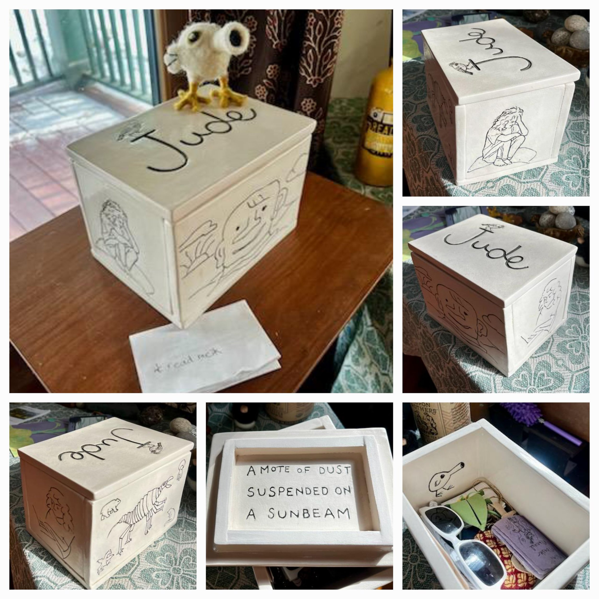 For my brother's family, I designed a clay memory box where each family member contributed an image representing my nephew. I hand-etched these images into the sides and top of the box, creating a container that holds their collective memories.