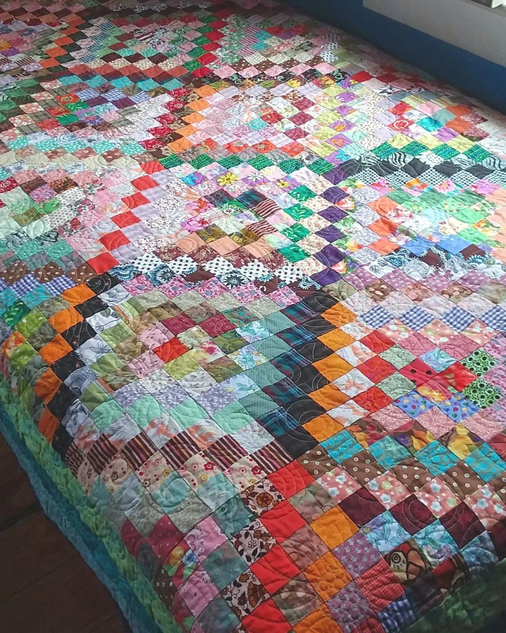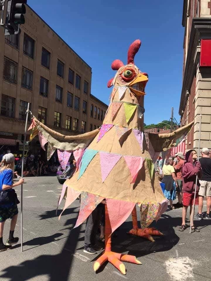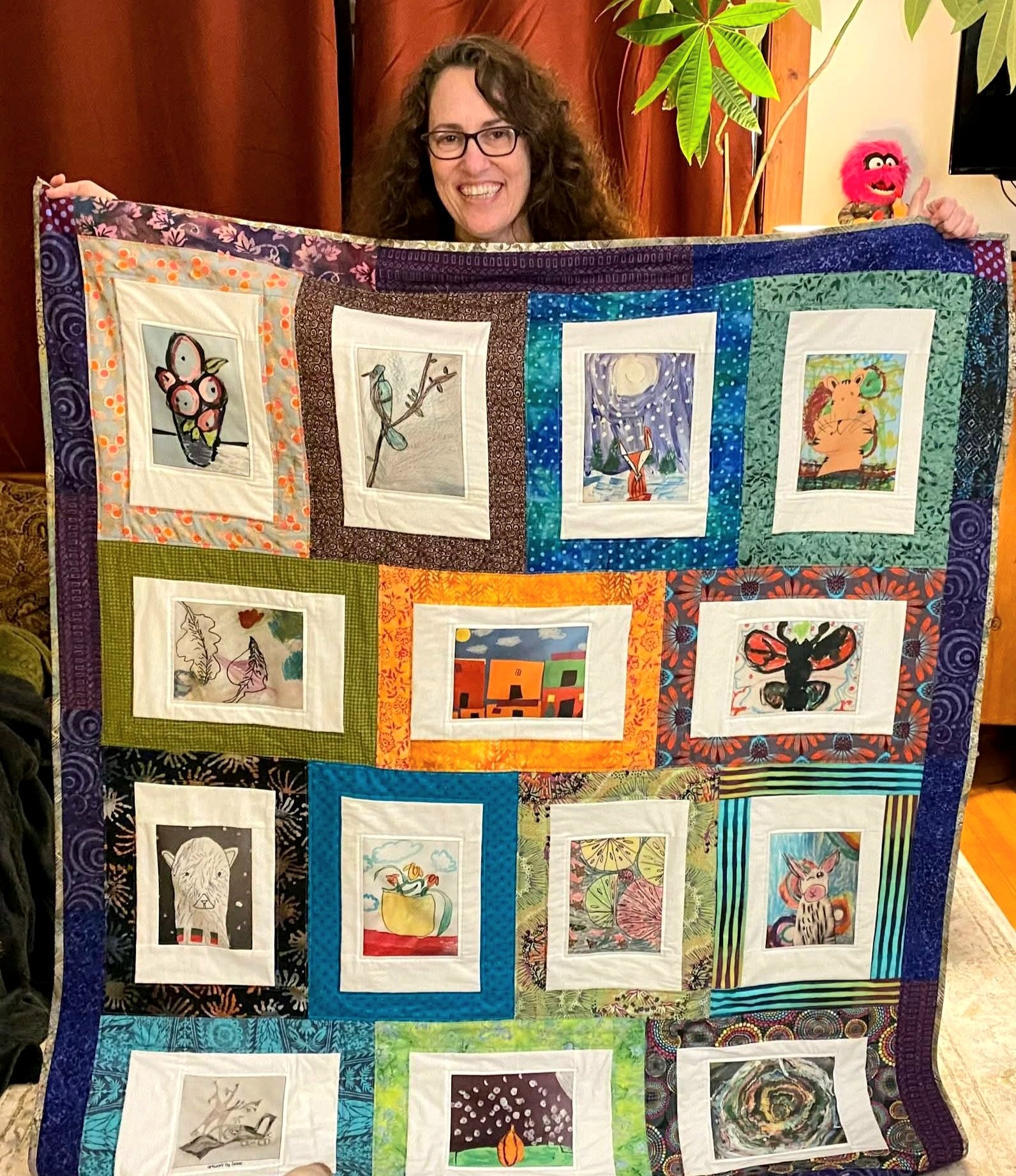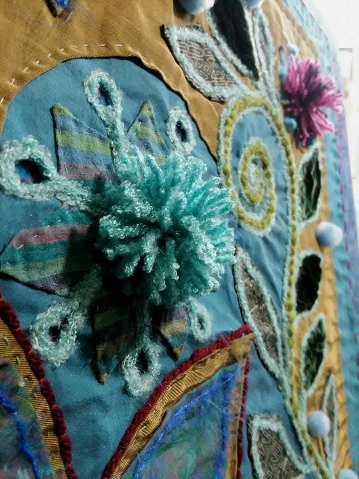 Honoring a friend through fabric: When my friend passed, I received her fabric collection and created two memorial pieces—a quilt for myself and decorative "flag feathers" for a large parade chicken I was creating. Both projects were infused with the love I felt for her; she was so present in my mind throughout the work.